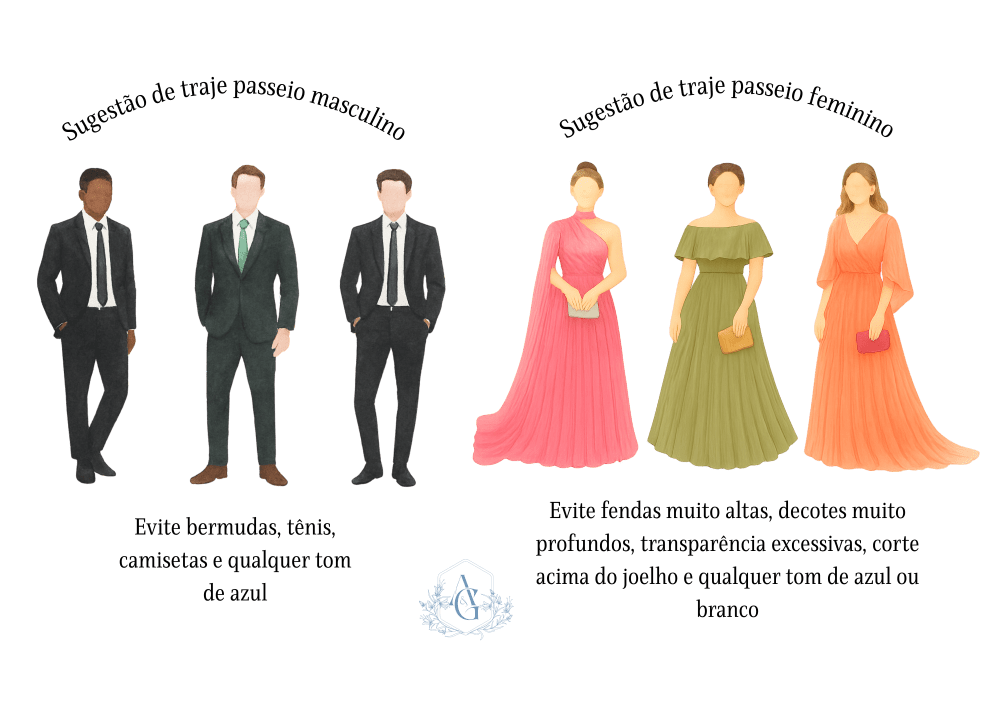 Por se tratar de uma cerimônia em igreja, pedimos atenção à modéstia, evitando roupas curtas, justas, decotadas, ombros ou costas totalmente à mostra, e fendas acima do joelho; se necessário, usem uma echarpe durante a cerimônia. Para os homens, o traje passeio é recomendado. Pedimos apenas que ninguém use branco ou azul (em qualquer tom).